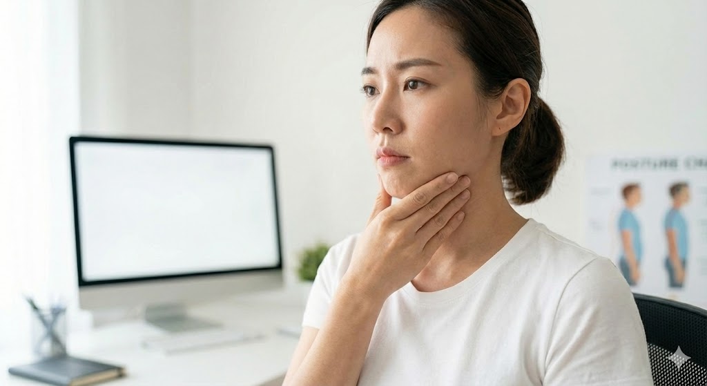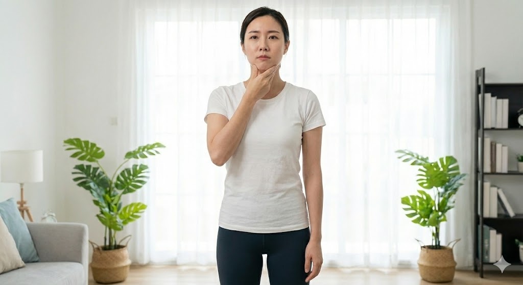 - 방법: 시선은 정면을 보고, 손가락으로 턱을 뒤로 지그시 밀어 넣습니다. 마치 뒷목이 길어지는 느낌으로 5초간 유지하세요. (이때 고개를 숙이는 게 아니라 수평으로 미는 게 포인트!)